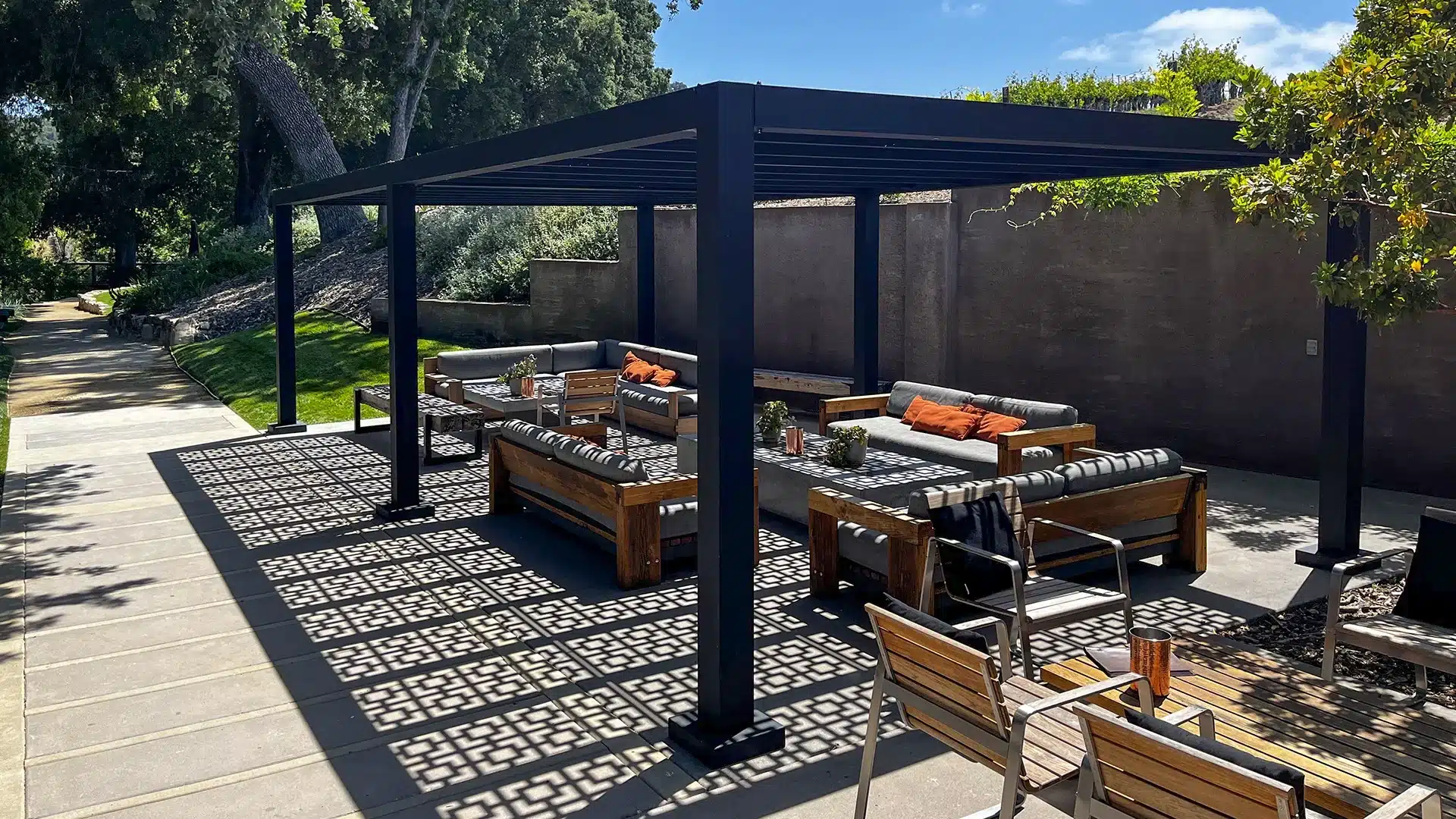 The factory manufactured aluminum pergola was quickly assembled on-site providing a savings in both time and man power. Plus its factory finish is highly durable requiring less maintenance over its lifespan.