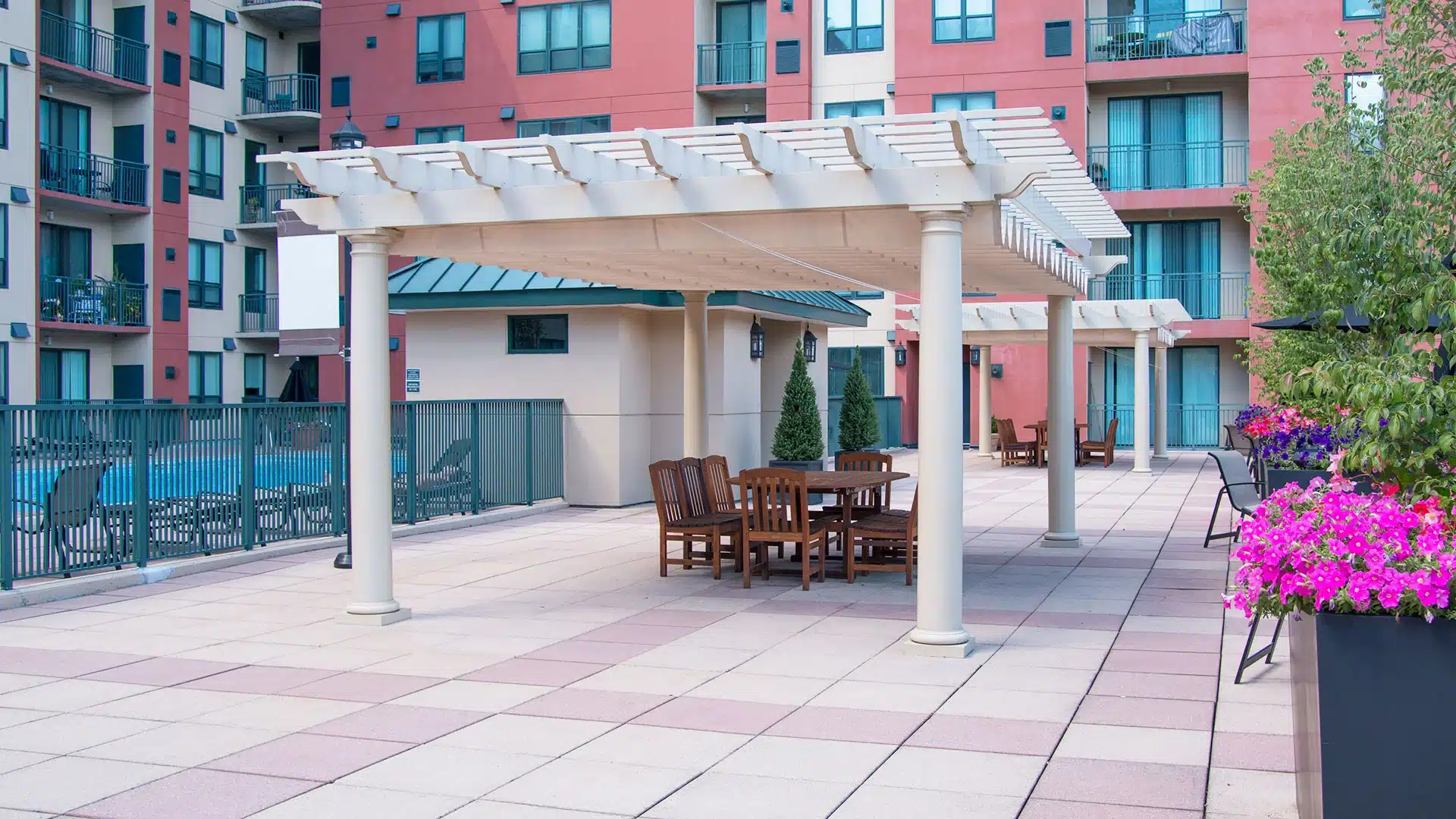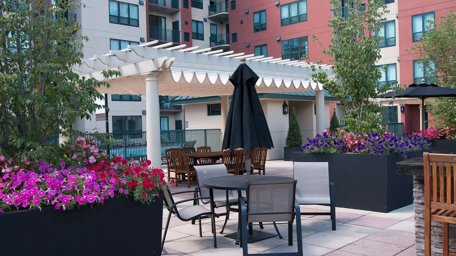 Merritt River Apartments, in Norwalk Connecticut, needed an update for their resort style courtyard to provide an inviting community space for resident use and social events throughout the year. With an expansive paver patio, heated pool and outdoor kitchen there was a need to create areas to dine and relax with shaded seating and the option for full or partial sun. Three large fiberglass pergolas were installed to complete each space while the wall pergola over the parking garage entrance helps add additional architectural interest to the apartmentโ€™s exterior, helping to complete the vision.