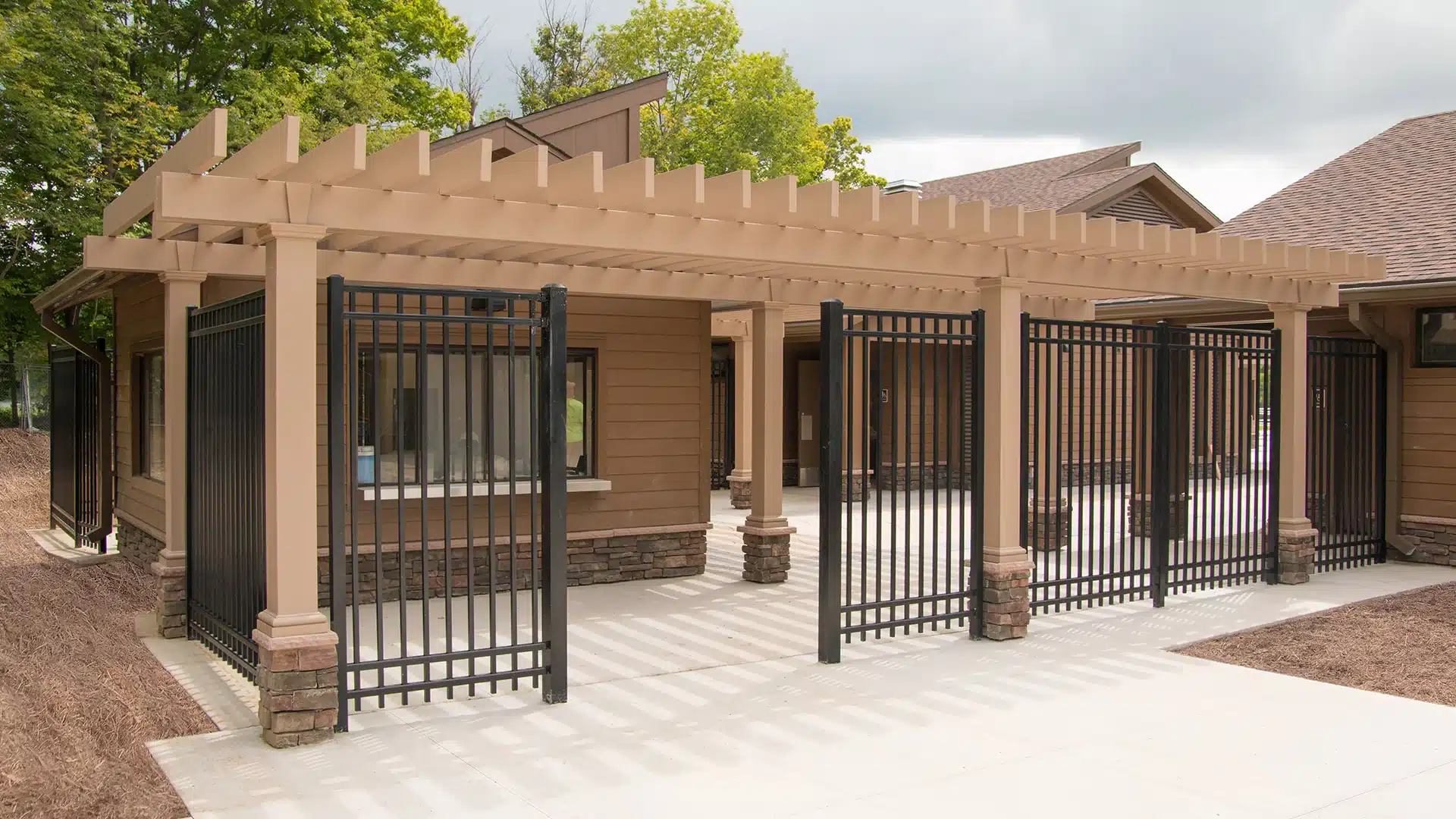 Pennsylvania Department of Conservation & Natural Resources, overseeing Lackawanna State Park, wanted to completely restore the old swimming pool complex. With a complete demolition of the existing pool, bathhouses, concession and ticket booth buildings, they made room for a splash park and all new facilities! Incorporating plenty of shade to this project was important so modern pergolas were integrated at the entrance of the new concession area and bathhouses. Structureworks was able to provide two architecturally pleasing and functional low-maintenance, fiberglass pergolas helping to complete the new look and feel of the Lackawanna State Park Pool.