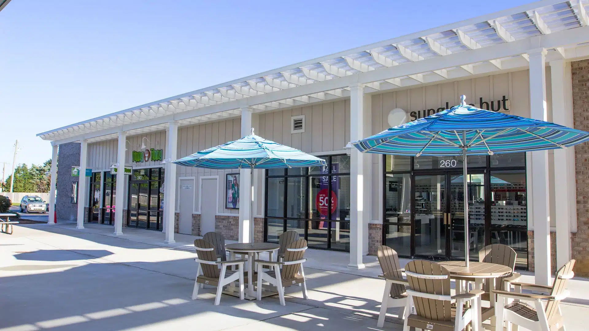 Rehoboth Beachโs 19-year-old outlets were recently renovated by Legacy Construction Services to keep the shopping center fresh. Looking to add depth to the store fronts, architectural detail and provide greater curb appeal, shade structures were utilized between Under Armour and VC Outlet. The structures now shield shoppers walking to the newly renovated restrooms and provides a seamless, dry transition between stores. Trex Pergola with ShadeRight Fixed canopy was the ideal choice for form and function and helped complete the update.
