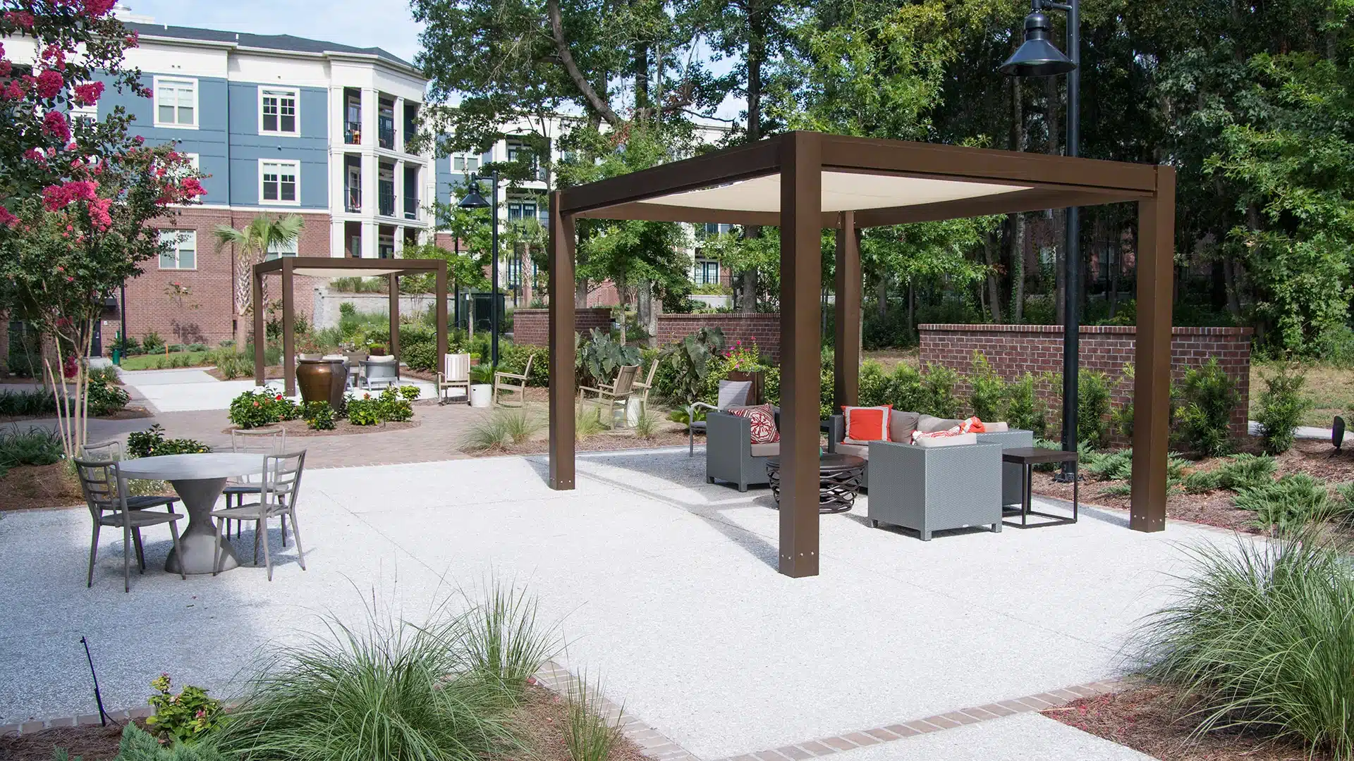 Expanding the already impressive amenities, Structureworks was able to work with J Banks Design to add yet another outdoor living experience at these coastal apartment homes. Not interested in hanging by the salt water pool or hitting the gym? Now residents can chill out under the cooling cover of these classically designed Serenity Solis shade structures. The tensioned canopy and low-maintenance powder coat finish work well in this salty aired community providing a sense of enclosure and unmatched functionality throughout the seasons. The Standard has risen again, with the addition of this beautiful courtyard space.