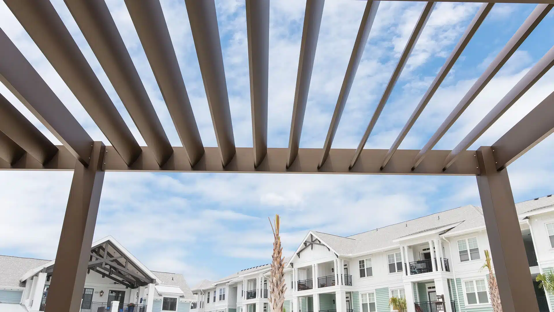 Boasting beautiful views and peaceful surrounds, this young island town offers endless outdoor attractions and warm sea breezes. Wharf 7 is a Charleston apartment community situated on Daniel Island near Governorโ€™s Park. With amenities like the saltwater pool, amphitheater and distinctive shade structure with airfoil rafters, there is never a dull moment. The shade structure creates protection from the sun and provides visual interest to the common area. Structureworks helped complete the space with a low-maintenance, powder coated aluminum Serenity, able to withstand all that coastal living has to offer.ย  ย