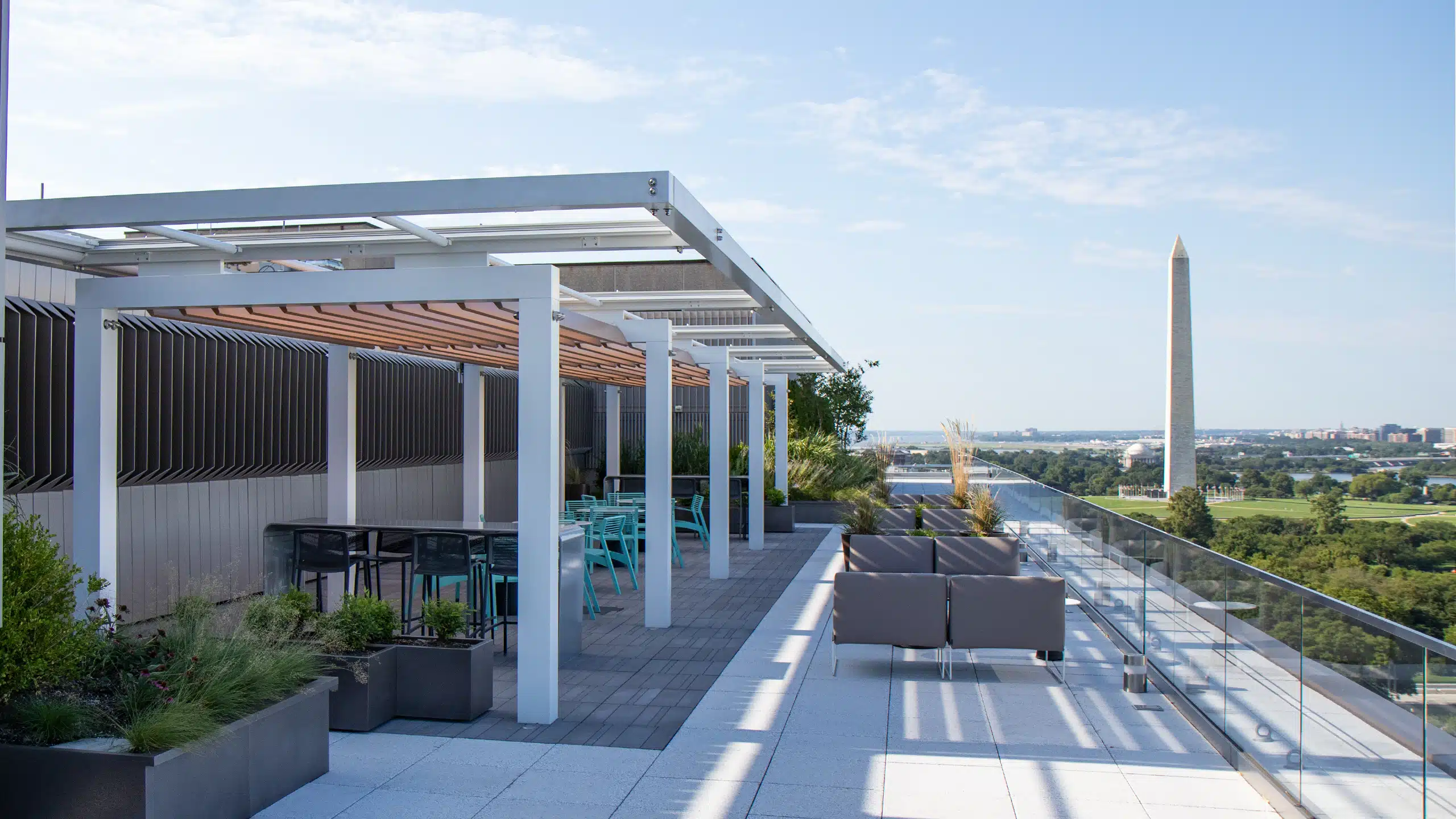 A clean aluminum pergola fitted with a tensioned HDPE canopy provides protection from the sun and adds beauty to any space.