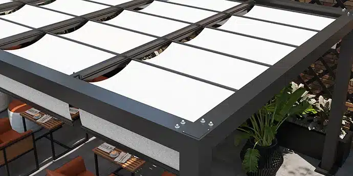 Breeze is a simple aluminum pergola fitted with retractable ShadeFlex canopies that provide variable protection from the sun and adds beauty to any outdoor space.